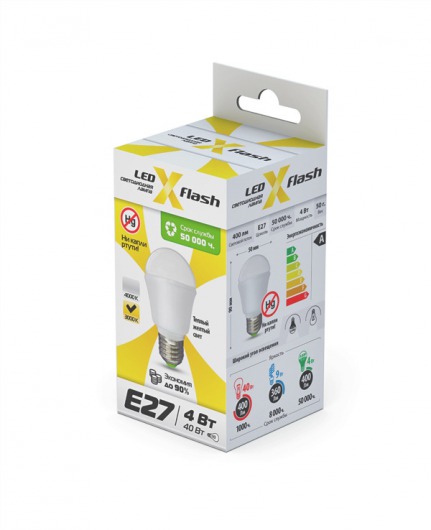Cветодиодная лампа X-Flash MINI E27 4W оптимально подходит для всех типов светильников, которые рассчитаны на лампы накаливания с таким цоколем. Колба у лампы матовая, сферической шаровидной формы. Алюминиевый радиатор led лампы способствует понижению температуры внутри нее, тем самым увеличивается срок службы. Данная модель рассчитана на напряжение 220 В. Мощность диодной лампы X-Flash — 4 Вт., яркость — 420 Лм, а температура свечения – 4000 K (это нейтральный белый свет).