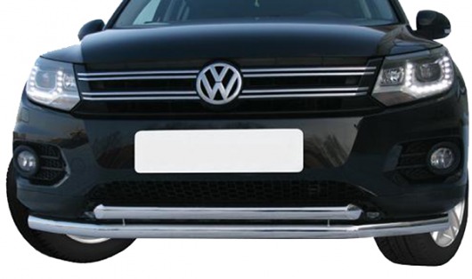 Защита переднего бампера для Volkswagen Tiguan – это двойная труба на бампер из нержавеющей стали диаметром 60/60 мм.