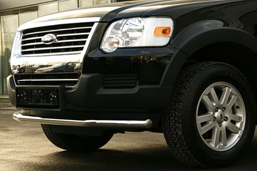 Защита переднего бампера труба предназначена для автомобилей Ford Explorer 2006-2010 г.в. Вам не придется подгонять защиту под размеры бампера вашего авто. И с монтажом проблем не возникнет: установка защиты переднего бампера производится в штатные отверстия, а значит, необходимость сверлить кузов отпадает.