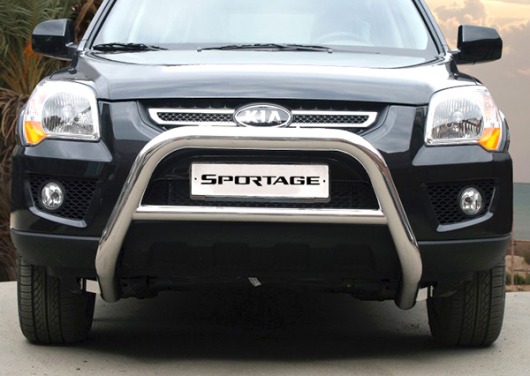 Передняя решетка Kia Sportage (кенгурятник) – это защитная дуга на бампер из нержавеющей стали диаметром 76 мм.