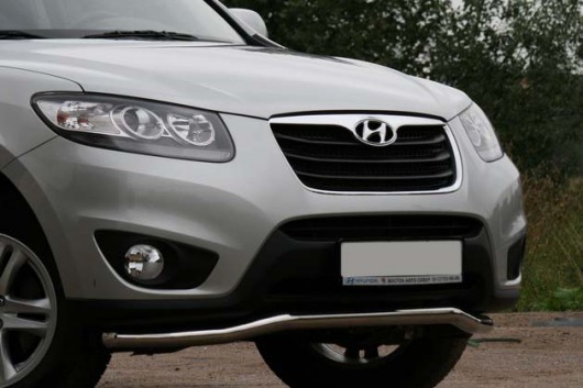 Защита переднего бампера труба предназначена для автомобилей Hyundai Santa Fe 2010-2012 г.в. Вам не придется подгонять защиту под размеры бампера вашего авто. И с монтажом проблем не возникнет: установка защиты переднего бампера производится в штатные отверстия, а значит, необходимость сверлить кузов отпадает.