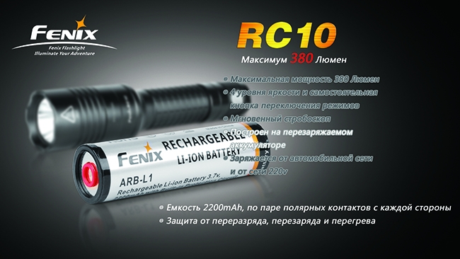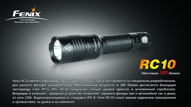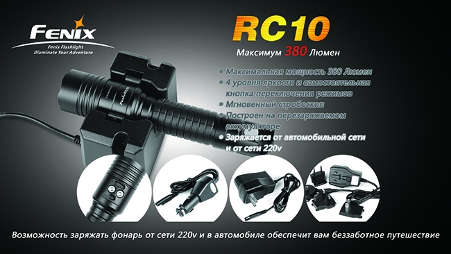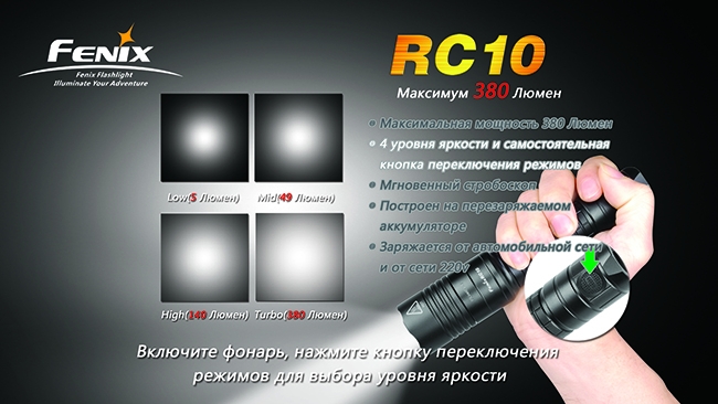 Тактический фонарь Fenix RC10 — модель, резко отличающаяся от огромного большинства фонарей Fenix. В отличие от них, модель питается не от сменных батарей одного из известных типов, а от собственного перезаряжаемого аккумулятора. При этом подзаряжать элемент питания можно как дома, так и в автомобиле. В результате Вы сможете практически всегда без помех заряжать свой фонарь и не тратиться на элементы питания.