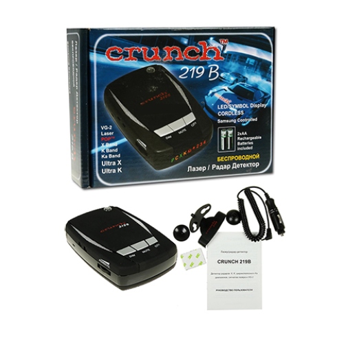 Радар-детектор Crunch 219B обнаружит не только полицейские радары, но и особые полицейские лазеры, а так же сигналы всех импульсных радаров. Помимо этого аппарат имеет защиту от пеленгаторов VG-2. Светодиодный дисплей, на котором отображаются символами определяемые диапазоны, имеет возможность регулировать яркость и чувствительность.