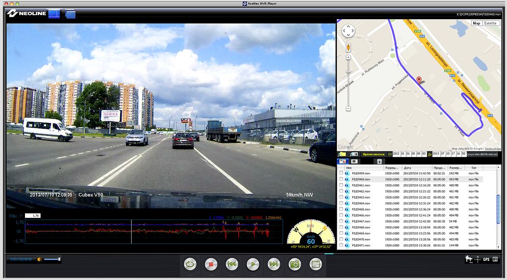 GPS-трекер. GPS-приемник позволяет определять ваше местоположение во время движения (на 2-х картинках снизу: чем быстрее скорость, тем краснее маршрут). Запись данных с приемника и видеозапись ведутся одновременно, что делает ваш видеорегистратор бортовым самописцем.
