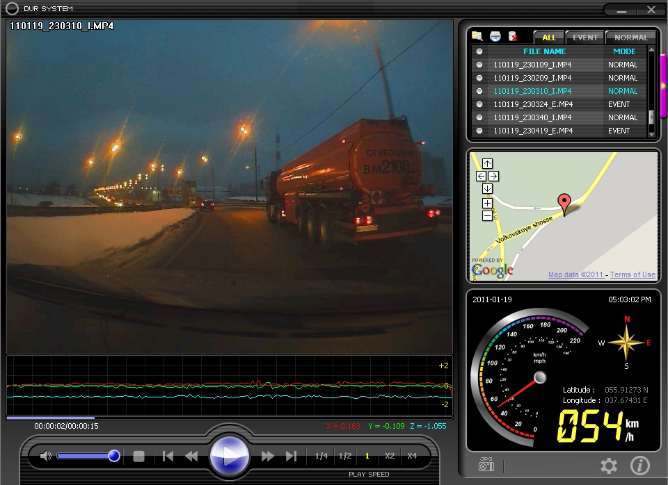 Модель PVDR-0163 auto имеет важную особенность - встроенный GPS-модуль, который параллельно с записью видео фиксирует данные о местоположении автомобиля, его скорости и направления движения. Такая инновация позволит восстановить реальный ход событий и выявить действительного виновника ДТП. Информация отображается на Google-карте в реальном времени. Здесь вы можете просотреть видеоролик, который демонстрирует интерфейс прибора и пример съемки.