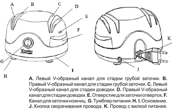 Хозяйка 40М точит не только ножи, но и ножницы и отвертки. Для этого на корпусе предусмотрены специальные слоты. Втягивающийся шнур питания обеспечивает большую компактность и удобство хранения и транспортировки.