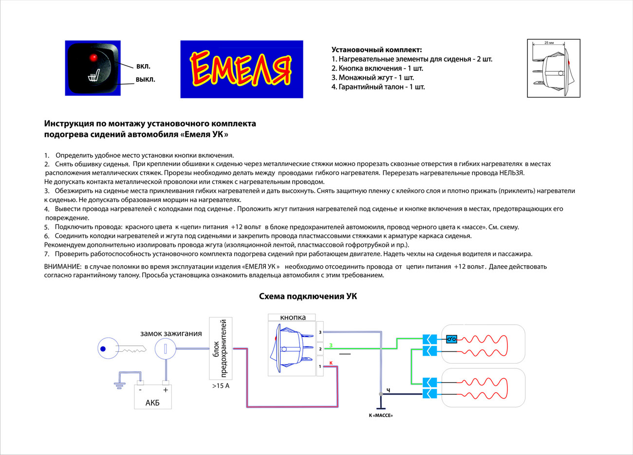 Установочный комплект Емеля УК — гибкий электрический нагреватель, который монтируется под обшивку 1 сидения Вашего автомобиля. Комплект поможет вам зимой избежать дискомфорта от постоянного холода, сократит риск переохлаждения и простудных заболеваний. В конструкции применяется нагревательный провод. С подогревом сиденья Емеля Вы сможете чувствовать себя в автомобиле уютно и комфортно, какой бы холод ни стоял за окном!