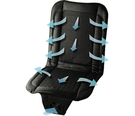 Накидка с охлаждением PSV воздухопроницаемая, она "дышит" по всей поверхности. При этом воздух подается дозированно, чтобы вы не застудили поясницу и другие части тела. Воздух в накидку поступает от вентилятора, который крепится под сиденьем (это удобно и незаметно). Модель имеет реле с переключением скоростей.