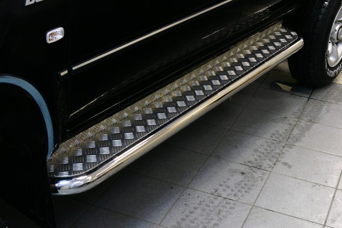 Боковые пороги на Hyundai Terracan из нержавеющей стали диаметром 60 мм не боятся коррозии, сколов и царапин и выдерживают большие нагрузки. Боковые подножки-пороги с листом сделаны специально для автомобилей Hyundai Terracan от 2005 г.в., легко устанавливаются и стильно смотрятся. В комплекте вы получите 2 подножки.